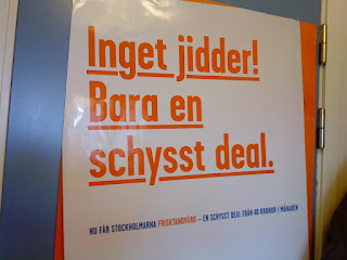 förorättade" som hänger på Moderna Museet. Hon ska berätta om socialförsäkringar och hur vi ska gå till väga om vårt handikapp gör att vi halkar ur systemet. I stället håller hon ett föredrag om hur dåligt allt har blivit, hur hårda försäkringskassorna är och hur synd det är om folk i Norrland som måste flytta dit jobben är. "Tänk er själva, att lämna en plats man levt hela livet. Nu ska ju alla företag slimmas. Människor hamnar utanför."